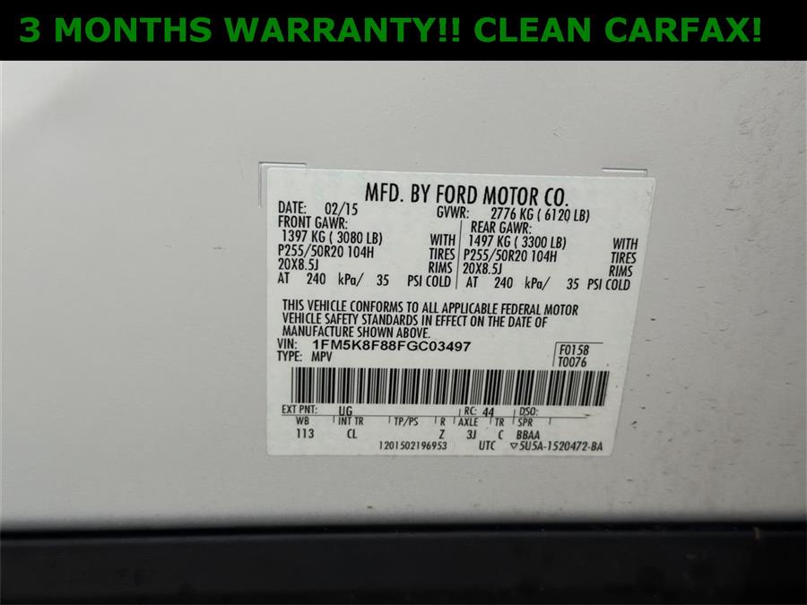 LOCAL TRADE, 4WD, 12 Speakers, 20" Painted Aluminum Wheels, 20" Polished Aluminum Wheels, 3.65 Axle Ratio, 3rd row seats: split-bench, 4-Wheel Disc Brakes, ABS brakes, Adjustable pedals, Air Conditioning, Alloy wheels, AM/FM radio: SiriusXM, Auto-dimming Rear-View mirror, Automatic temperature control, Brake assist, Bumpers: body-color, CD player, Compass, Delay-off headlights, Driver door bin, Driver vanity mirror, Dual front impact airbags, Dual front side impact airbags, Dual-Panel Moonroof, Electronic Stability Control, Equipment Group 301A, Exterior Parking Camera Rear, Four wheel independent suspension, Front anti-roll bar, Front Bucket Seats, Front Center Armrest, Front dual zone A/C, Front fog lights, Front reading lights, Fully automatic headlights, Garage door transmitter: HomeLink, Heated 2nd Row Bucket Seats, Heated door mirrors, Heated front seats, Heated rear seats, Heated Steering Wheel, Illuminated entry, Knee airbag, Leather-Trimmed Heated Bucket Seats, License Plate Bracket, Low tire pressure warning, Luxury Seating Package, Memory seat, Occupant sensing airbag, Outside temperature display, Overhead airbag, Overhead console, Panic alarm, Passenger door bin, Passenger vanity mirror, Pedal memory, Perf Leather-Trimmed Heated/Cooled Bucket Seats, Power door mirrors, Power driver seat, Power Liftgate, Power passenger seat, Power steering, Power Tilt/Telescoping Steering Wheel, Power windows, PowerFold 3rd Row Seat, Premium audio system: Sony, Radio data system, Radio: Sony Audio System w/12-Speakers, Rear air conditioning, Rear anti-roll bar, Rear Parking Sensors, Rear reading lights, Rear seat center armrest, Rear window defroster, Rear window wiper, Remote keyless entry, Roof rack: rails only, Security system, Speed control, Speed-sensing steering, Speed-Sensitive Wipers, Split folding rear seat, Spoiler, Steering wheel mounted audio controls, SYNC w/MyFord Touch, Tachometer, Telescoping steering wheel, Tilt steering wheel, Traction control, Trip computer, Turn signal indicator mirrors, Variably intermittent wipers, Voice-Activated Navigation System, 4WD.