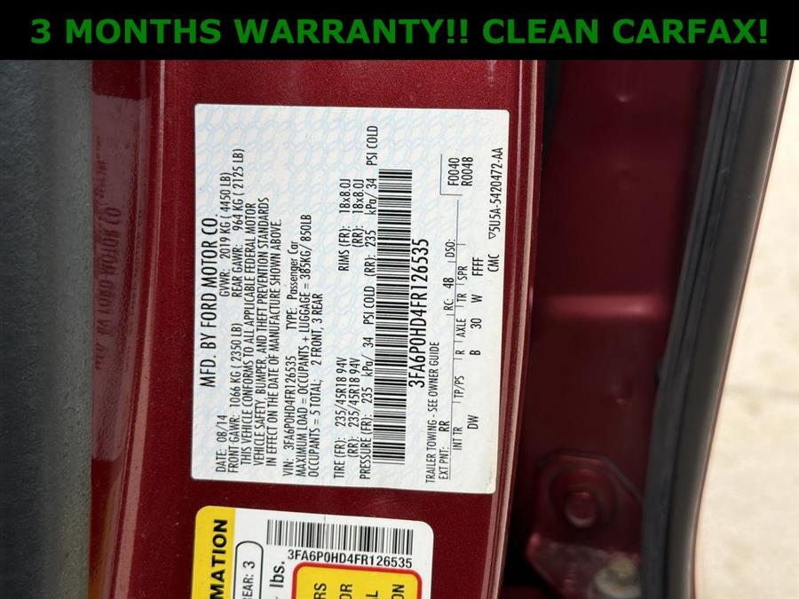NON SMOKER, NEW TIRES, 6-Speed Automatic, 17" Painted Aluminum Wheels, 18" Premium Painted Sport Wheels, 4-Wheel Disc Brakes, 6 Speakers, ABS brakes, Air Conditioning, Alloy wheels, AM/FM radio: SiriusXM, Appearance Package, Brake assist, Bumpers: body-color, CD player, Cloth Front Bucket Seats, Compass, Delay-off headlights, Driver door bin, Driver vanity mirror, Dual front impact airbags, Dual front side impact airbags, EcoCloth Front Bucket Seats, Electronic Stability Control, Equipment Group 201A, Exterior Parking Camera Rear, Fog Lamps, Four wheel independent suspension, Front anti-roll bar, Front Bucket Seats, Front Center Armrest, Front License Plate Bracket, Front reading lights, Fully automatic headlights, Heated door mirrors, Illuminated entry, Knee airbag, Leather-Wrapped Steering Wheel, Low tire pressure warning, Moonroof, Occupant sensing airbag, Outside temperature display, Overhead airbag, Overhead console, Panic alarm, Passenger door bin, Passenger vanity mirror, Power door mirrors, Power driver seat, Power passenger seat, Power steering, Power windows, Radio data system, Radio: AM/FM Stereo/MP3/Single-CD, Rear anti-roll bar, Rear reading lights, Rear seat center armrest, Rear Spoiler, Rear window defroster, Remote keyless entry, Security system, SIRIUS Satellite Radio, Speed control, Speed-sensing steering, Speed-Sensitive Wipers, Split folding rear seat, Steering wheel mounted audio controls, SYNC Communications & Entertainment System, Tachometer, Telescoping steering wheel, Tilt steering wheel, Traction control, Trip computer, Turn signal indicator mirrors, Universal Garage Door Opener, Variably intermittent wipers, CLEAN CARFAX!!, 6-Speed Automatic.