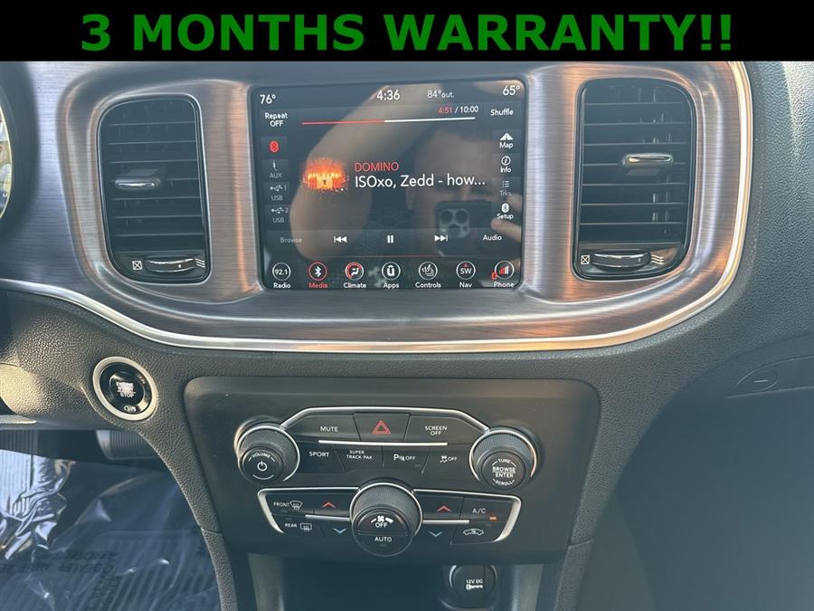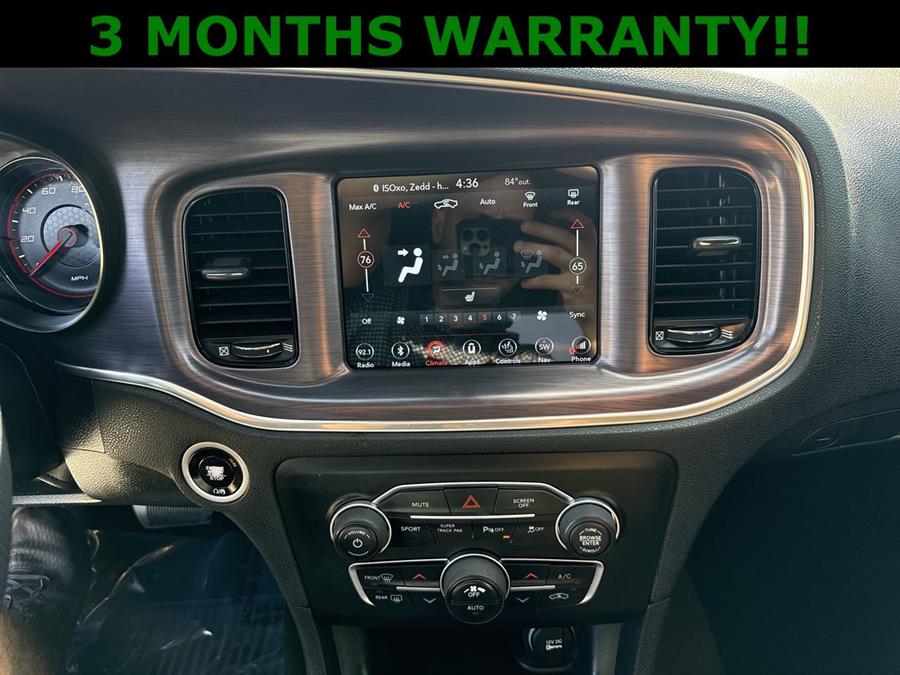 Leather Seats, NEW TIRES, AWD, Black Cloth, 300 HP Power Rating, 4-Wheel Disc Brakes, 5-Year SiriusXM Traffic Service, 5-Year SiriusXM Travel Link Service, 6 Speakers, ABS brakes, Air Conditioning, Alloy wheels, AM/FM radio: SiriusXM, Anti-whiplash front head restraints, Apple CarPlay/Android Auto, Auto-Dimming Exterior Driver Mirror, Auto-dimming Rear-View mirror, Automatic temperature control, Black 1-Piece Performance Spoiler, Blacktop Package, Blind Spot & Cross Path Detection, Blind Spot Power Heated Mirror, Brake assist, Bumpers: body-color, Cloth Sport Seat, Compass, Dark Brushed II Interior Accents, Delay-off headlights, Delete Badge, Dodge Grille Badge, Driver & Passenger Lower LED Lamps, Driver Confidence Group, Driver door bin, Driver vanity mirror, Dual front impact airbags, Dual front side impact airbags, Electronic Stability Control, Emergency communication system: SiriusXM Guardian, Exterior Mirrors Courtesy Lamps, Four wheel independent suspension, Front anti-roll bar, Front Bucket Seats, Front Center Armrest, Front dual zone A/C, Front fog lights, Front reading lights, Fully automatic headlights, Garage door transmitter: HomeLink, Gloss Black Fascia Applique, Gloss Black I/P Cluster Trim Rings, Heated door mirrors, Heated Front Seats, Heated front seats, Illuminated entry, Knee airbag, Leather Shift Knob, Low tire pressure warning, Manufacturer's Statement of Origin, Navigation & Travel Group, Occupant sensing airbag, Outside temperature display, Overhead airbag, Overhead console, Panic alarm, ParkView Rear Back-Up Camera, Passenger door bin, Passenger vanity mirror, Performance Steering Wheel, Power 4-Way Driver Lumbar Adjust, Power 8-Way Driver Seat, Power door mirrors, Power driver seat, Power steering, Power windows, Quick Order Package 28H GT, R/T Front End Appearance, Radio data system, Radio: Uconnect 4C Nav w/8.4" Display, Radio: Uconnect 4C w/8.4" Display, Rear anti-roll bar, Rear Armrest w/Cupholder Seat, Rear reading lights, Rear seat center armrest, Rear window defroster, Remote keyless entry, Satin Black Charger Decklid Badge, SiriusXM Traffic Plus, SiriusXM Travel Link, Speed control, Speed-Sensitive Wipers, Split folding rear seat, Spoiler, Sport Mode, Steering wheel mounted audio controls, Steering Wheel Mounted Shift Control, Tachometer, Telescoping steering wheel, Tilt steering wheel, Traction control, Trip computer, Variably intermittent wipers, Wheels: 19" x 7.5" Painted Granite Crystal, AWD, Black Cloth.