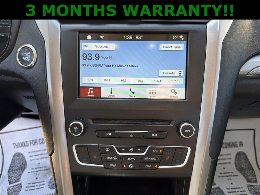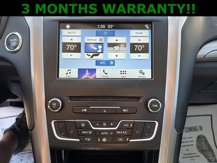 NEW TIRES, 6-Speed Automatic, 4-Wheel Disc Brakes, 6 Speakers, ABS brakes, Air Conditioning, All-Weather Front & Rear Floor Mats, Alloy wheels, AM/FM radio: SiriusXM, Brake assist, Bumpers: body-color, CD player, Cloth Front Bucket Seats, Compass, Delay-off headlights, Driver door bin, Driver vanity mirror, Dual front impact airbags, Dual front side impact airbags, Dual-Zone Electronic Automatic Temperature Control, Electronic Stability Control, Emergency communication system: 911 Assist, Equipment Group 200A, Exterior Parking Camera Rear, Four wheel independent suspension, Front anti-roll bar, Front Bucket Seats, Front Center Armrest, Front reading lights, Fully automatic headlights, Fusion SE Cold Weather Package, Fusion SE Technology Package, Heated Front Seats, Illuminated entry, Knee airbag, Low tire pressure warning, Occupant sensing airbag, Outside temperature display, Overhead airbag, Overhead console, Panic alarm, Passenger door bin, Passenger vanity mirror, Power door mirrors, Power driver seat, Power passenger seat, Power steering, Power windows, Radio data system, Radio: AM/FM Stereo/MP3/Single-CD, Rear anti-roll bar, Rear reading lights, Rear seat center armrest, Rear window defroster, Remote keyless entry, Security system, SiriusXM Radio, Speed control, Speed-sensing steering, Speed-Sensitive Wipers, Split folding rear seat, Steering wheel mounted audio controls, SYNC 3 Communications & Entertainment System, SYNC Communications & Entertainment System, Tachometer, Telescoping steering wheel, Tilt steering wheel, Traction control, Trip computer, Upgraded Sideview Mirrors - Heated, Variably intermittent wipers, Wheels: 17" Sparkle Silver Painted Aluminum, 3 MONTHS WARRANTY!!, 6-Speed Automatic.