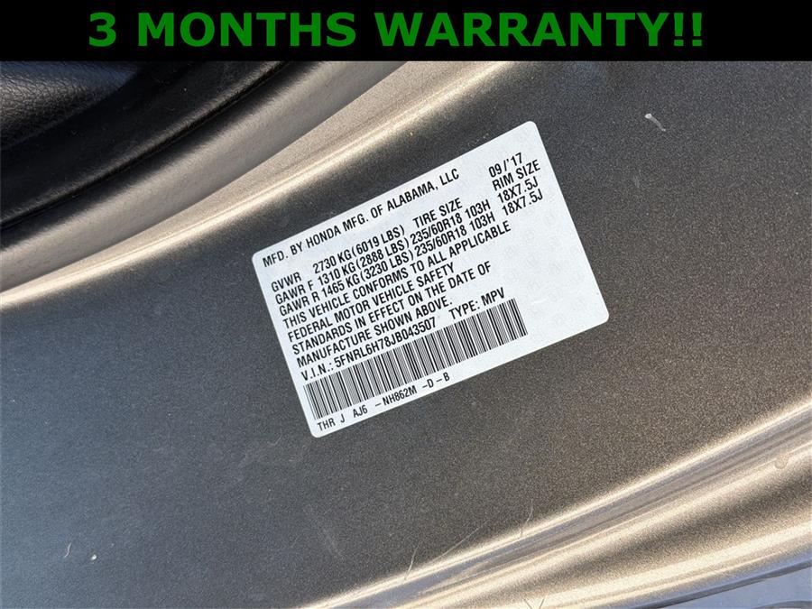 Leather Seats, Sunroof/Moonroof, Third Row Seating, Heated Seats, Apple Carplay/Android Auto, NON SMOKER, NEW TIRES, 3rd row seats: split-bench, 4-Wheel Disc Brakes, 4.33 Axle Ratio, 7 Speakers, ABS brakes, Air Conditioning, Alloy wheels, AM/FM radio: SiriusXM, Anti-whiplash front head restraints, Apple CarPlay/Android Auto, Auto High-beam Headlights, Auto-dimming Rear-View mirror, Automatic temperature control, Blind Spot Information (BSI) System warning, Brake assist, Bumpers: body-color, Delay-off headlights, Driver door bin, Driver vanity mirror, Driver's Seat Mounted Armrest, Dual front impact airbags, Dual front side impact airbags, Electronic Stability Control, Emergency communication system: HondaLink, Exterior Parking Camera Rear, Four wheel independent suspension, Front anti-roll bar, Front Bucket Seats, Front dual zone A/C, Front fog lights, Front reading lights, Fully automatic headlights, Garage door transmitter: HomeLink, Heated door mirrors, Heated Front Bucket Seats, Heated front seats, Illuminated entry, Knee airbag, Leather Seat Trim, Leather steering wheel, Low tire pressure warning, Memory seat, Occupant sensing airbag, Outside temperature display, Overhead airbag, Overhead console, Panic alarm, Passenger door bin, Passenger seat mounted armrest, Passenger vanity mirror, Power door mirrors, Power driver seat, Power Liftgate, Power moonroof, Power passenger seat, Power steering, Power windows, Radio data system, Radio: 160-Watt AM/FM/HD/SiriusXM Audio System, Rear air conditioning, Rear anti-roll bar, Rear reading lights, Rear seat center armrest, Rear window defroster, Rear window wiper, Reclining 3rd row seat, Remote keyless entry, Security system, Speed control, Speed-sensing steering, Speed-Sensitive Wipers, Split folding rear seat, Spoiler, Steering wheel mounted audio controls, Tachometer, Telescoping steering wheel, Tilt steering wheel, Traction control, Trip computer, Turn signal indicator mirrors, Variably intermittent wipers, Wheels: 18" Silver-Painted Alloy, DVD PLAYER!!, 3 MONTHS WARRANTY!!.
