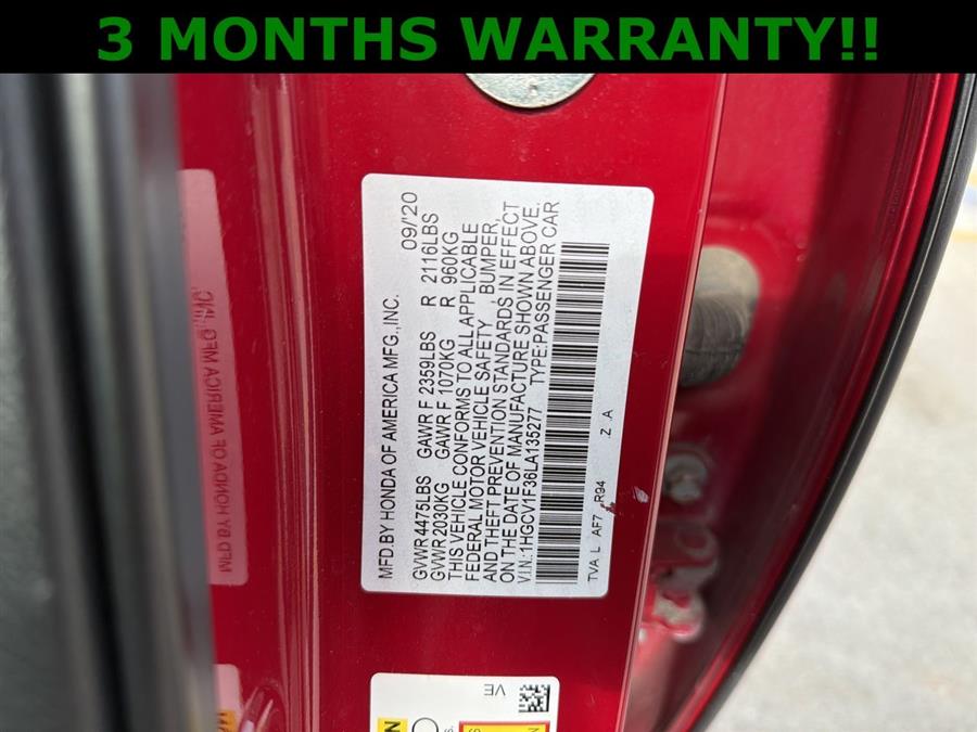Backup Camera, NEW TIRES, Black Cloth, 4-Wheel Disc Brakes, 8 Speakers, ABS brakes, Adaptive Cruise Control: Adaptive Cruise Control (ACC) with Low-Speed Follow, Air Conditioning, Alloy wheels, AM/FM radio, Apple CarPlay/Android Auto, Auto High-beam Headlights, Automatic temperature control, Brake assist, Bumpers: body-color, Cloth Seat Trim, Delay-off headlights, Driver door bin, Driver vanity mirror, Dual front impact airbags, Dual front side impact airbags, Electronic Stability Control, Emergency communication system: HondaLink, Exterior Parking Camera Rear, Forward collision: Collision Mitigation Braking System (CMBS) + FCW mitigation, Four wheel independent suspension, Front anti-roll bar, Front Bucket Seats, Front Center Armrest, Front dual zone A/C, Front fog lights, Front reading lights, Fully automatic headlights, Illuminated entry, Knee airbag, Lane Departure Warning System, Leather Shift Knob, Leather steering wheel, Low tire pressure warning, Occupant sensing airbag, Outside temperature display, Overhead airbag, Overhead console, Panic alarm, Passenger door bin, Passenger vanity mirror, Power door mirrors, Power driver seat, Power steering, Power windows, Radio data system, Radio: 180-Watt AM/FM Audio System, Rear anti-roll bar, Rear seat center armrest, Rear window defroster, Remote keyless entry, Security system, Speed control, Speed-sensing steering, Speed-Sensitive Wipers, Split folding rear seat, Spoiler, Steering wheel mounted audio controls, Tachometer, Telescoping steering wheel, Tilt steering wheel, Traction control, Trip computer, Variably intermittent wipers, Wheels: 19" Machine-Finished Alloy w/Black Inserts, Black Cloth.
