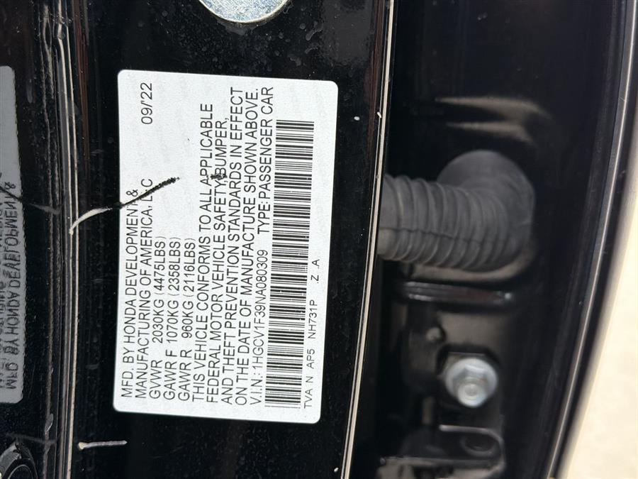 Backup Camera, Apple Carplay/Android Auto, NON SMOKER, NEW BRAKES, Black Artificial Leather, 4-Wheel Disc Brakes, 8 Speakers, ABS brakes, Adaptive Cruise Control: Adaptive Cruise Control (ACC) with Low-Speed Follow, Air Conditioning, Alloy wheels, AM/FM radio, Apple CarPlay/Android Auto, Auto High-beam Headlights, Automatic temperature control, Brake assist, Bumpers: body-color, Delay-off headlights, Driver door bin, Driver vanity mirror, Dual front impact airbags, Dual front side impact airbags, Electronic Stability Control, Emergency communication system: HondaLink, Exterior Parking Camera Rear, Fabric w/Synthetic Leather Seat Trim, Forward collision: Collision Mitigation Braking System (CMBS) + FCW mitigation, Four wheel independent suspension, Front anti-roll bar, Front Bucket Seats, Front Center Armrest, Front dual zone A/C, Front fog lights, Front reading lights, Fully automatic headlights, Illuminated entry, Knee airbag, Lane Departure Warning System, Leather Shift Knob, Leather steering wheel, Low tire pressure warning, Occupant sensing airbag, Outside temperature display, Overhead airbag, Overhead console, Panic alarm, Passenger door bin, Passenger vanity mirror, Power door mirrors, Power driver seat, Power steering, Power windows, Radio data system, Radio: 180-Watt AM/FM Audio System, Rear anti-roll bar, Rear seat center armrest, Rear window defroster, Remote keyless entry, Security system, Speed control, Speed-sensing steering, Speed-Sensitive Wipers, Split folding rear seat, Spoiler, Steering wheel mounted audio controls, Tachometer, Telescoping steering wheel, Tilt steering wheel, Traction control, Trip computer, Variably intermittent wipers, Wheels: 19" Machine-Finished Alloy w/Black Inserts, Adaptive Cruise Control, ONE OWNER!!, Black Artificial Leather.